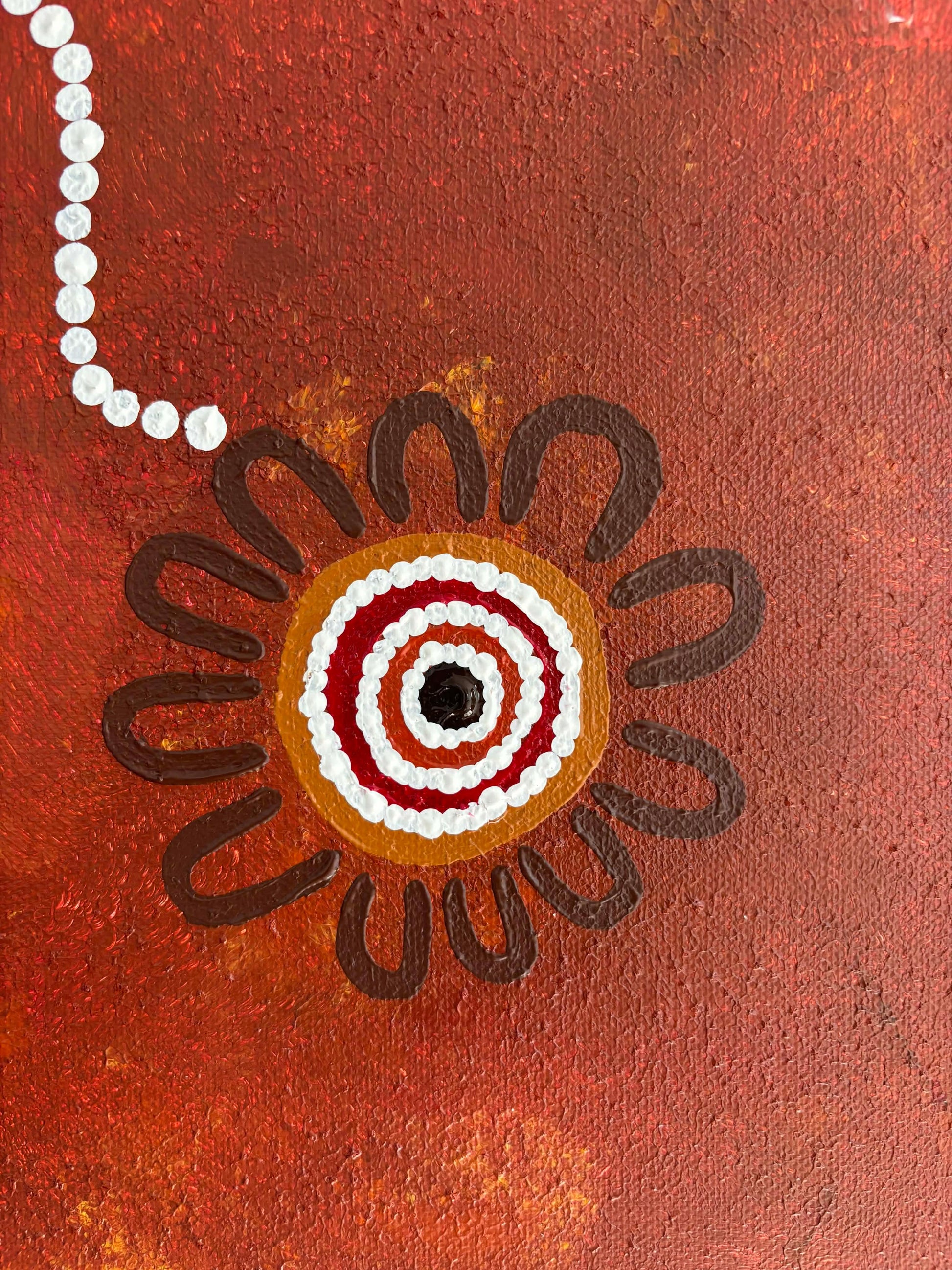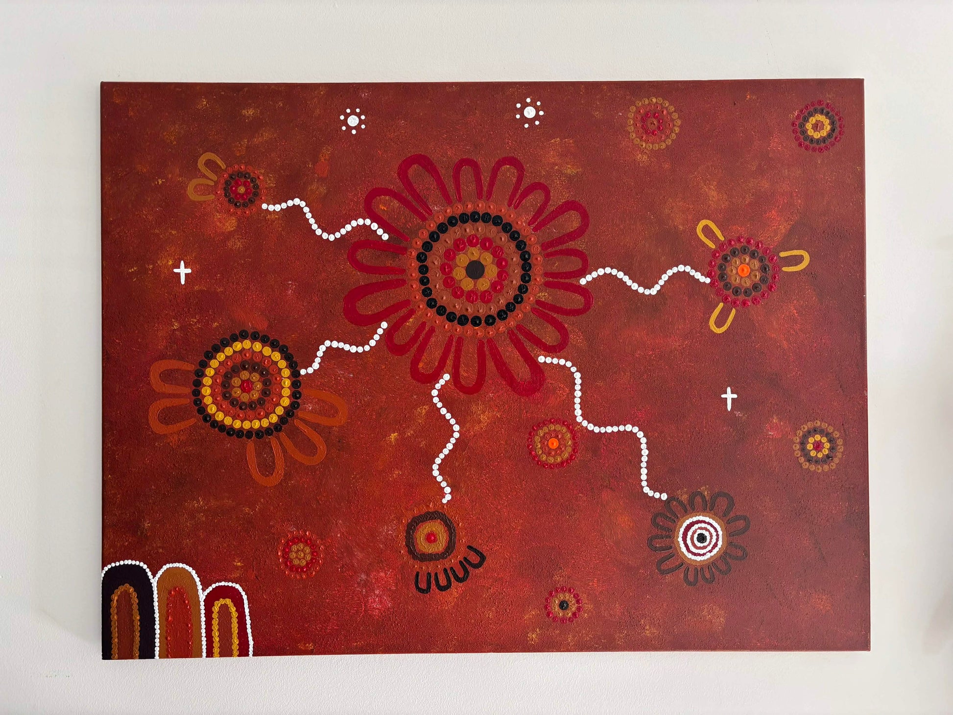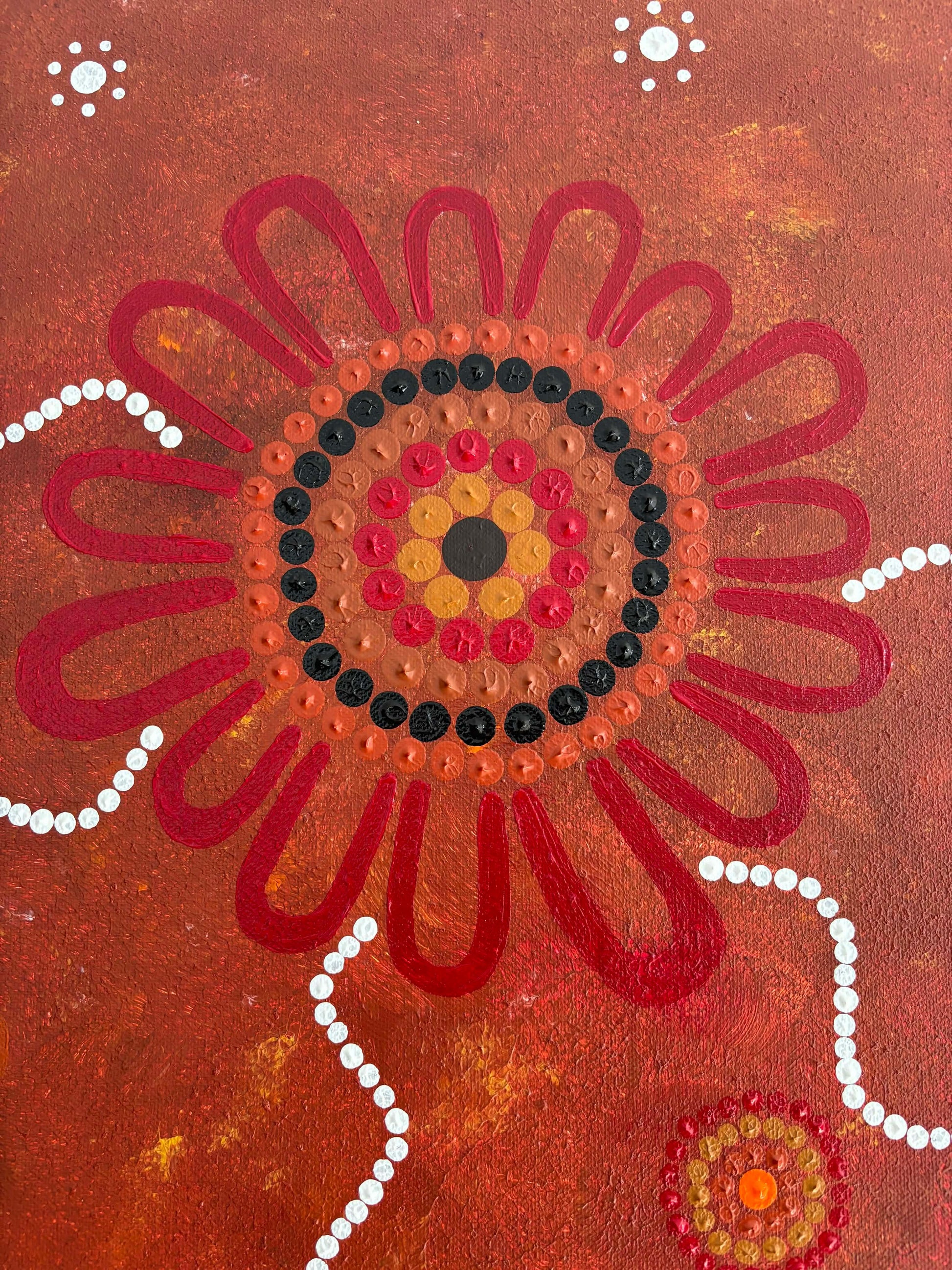 The deep red tones reflect the red dirt that surrounds us — the land that holds our stories and identity.