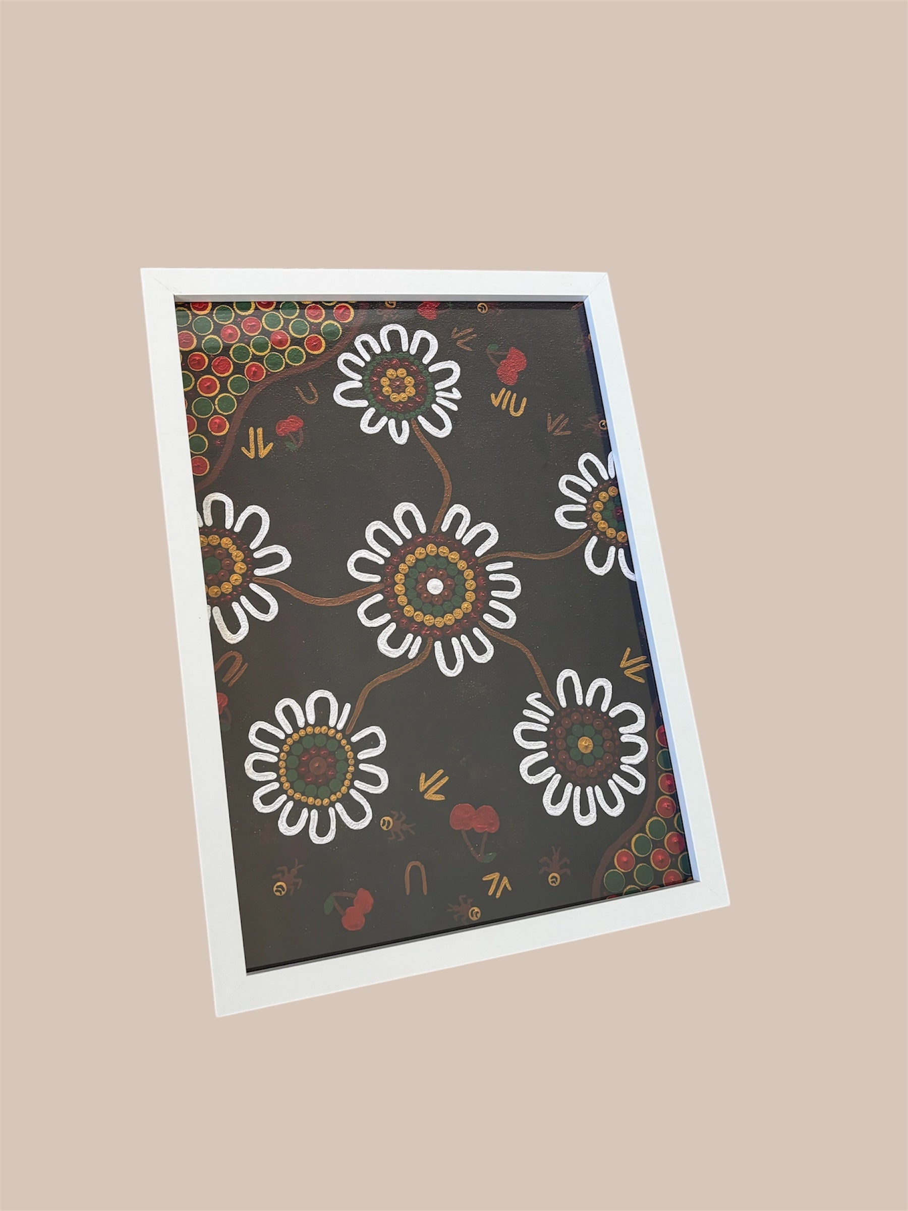 This artwork represents the spirit of coming together during the festive season. The cherries and honey ants symbolise the sweetness of gathering and sharing what the land provides. The hunter searching for roos shows the strength and traditions that continue through generations. At the heart of the painting is unity — families, friends, and different mobs coming together as one. It’s about connection, culture, and the warmth that Christmas brings to community.